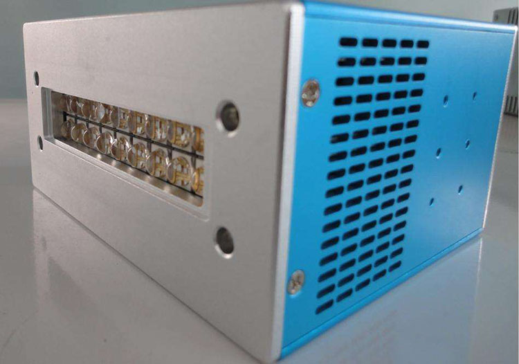 UV LED配備的特制聚光透鏡總成也使它的能量高度集中在固化點上,提升了紫外膠的固化效率,可以同時驅動8路(每臺設備可以裝8條LED管),分別獨立控制,為用戶降低成本,同時照射增大面積 。
