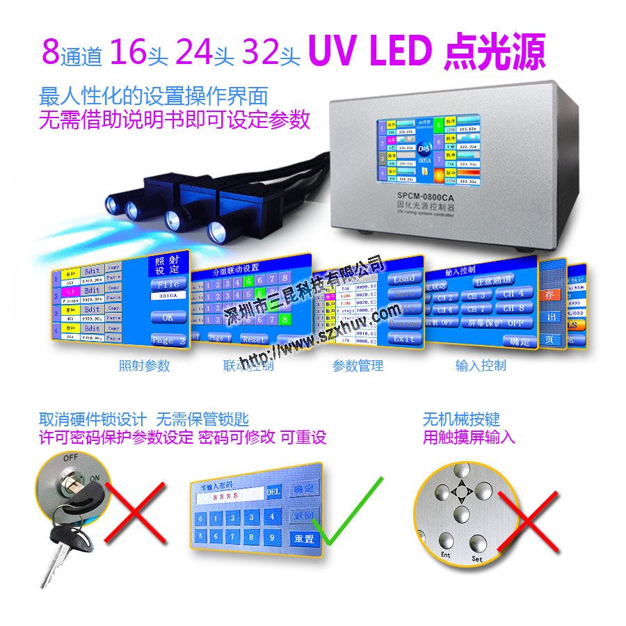 UVLED點光源控制器用專用的LED驅動IC,采用開關式恒流驅動控制,適應寬電壓輸入,效率高,驅動IC不需要添加散熱器,控制器為全鋁機箱全密封,長時間持續(xù)使用的情況下機箱內外溫度都還是很低。電路設計中所有需要考慮電流通過能力的場合,都采用了高余量設計,不存在局部發(fā)熱的問題,所以主機很耐用和很穩(wěn)定;